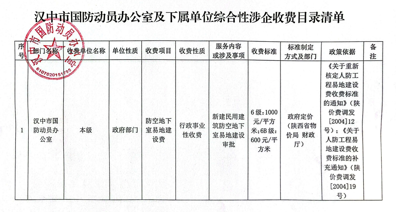 汉中市国防动员办公室及下属单位综合性涉企收费目录清单
